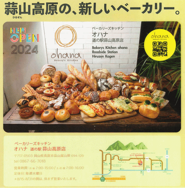 道の駅蒜山高原 改修工事後は、色々な種類の焼きたてパンがいただける「ベーカリーキッチン オハナ 蒜山高原店」へと生まれ変りました。2024年 8月15日オープン