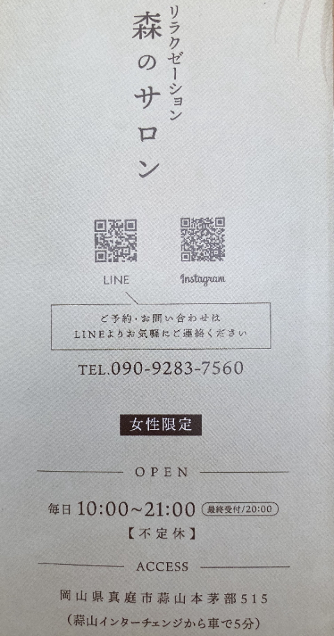 こちらの個室は基本女性限定ですが、夫婦やカップルや友達同士で施術を受ける場合は男性も可です。詳しくはラインで問合せてみましょう。
