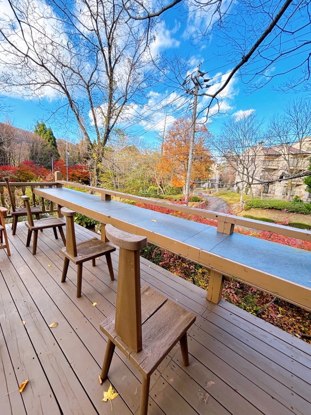 ウッドデッキには展望用のテーブルもいくつもありワンコ連れ歓迎となってます。