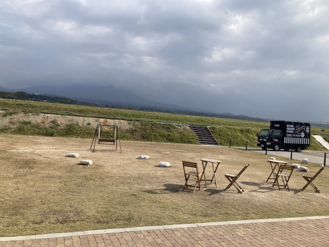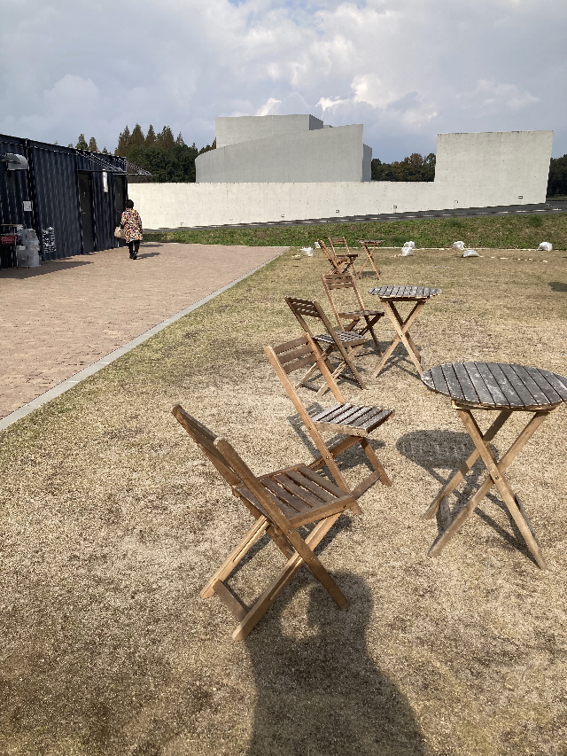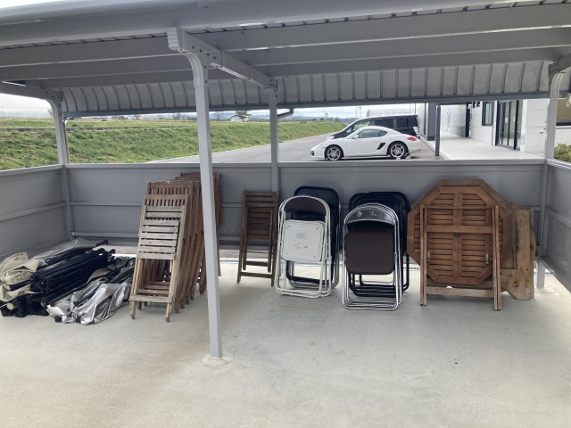 横の倉庫には椅子やテーブルや日よけの傘(ガーデンパラソル)がたくさん在庫してありました。とにかく芝生席を充実させて大山を眺めながら食事ができるように外の席に力を入れているようです!