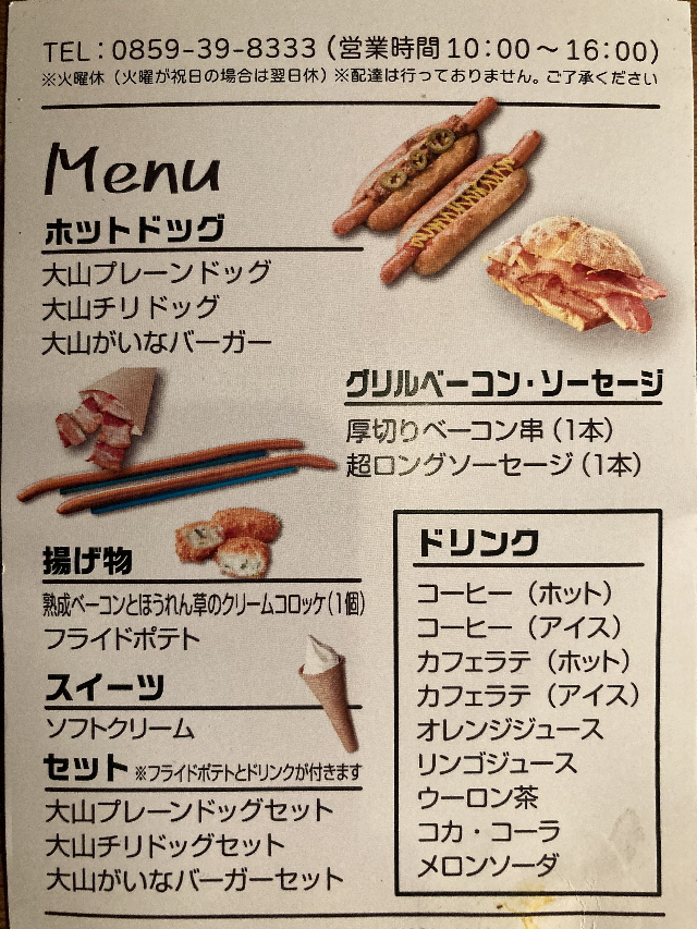 営業時間は10:00から16:00までで、火曜日が定休日です。美しい大山の景色を眺めながら、リラックスしたひとときを過ごすのにぴったりの場所です。ぜひ訪れてみてくださいね。