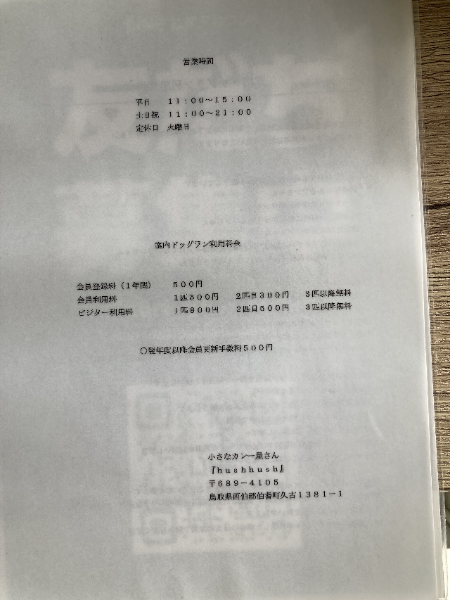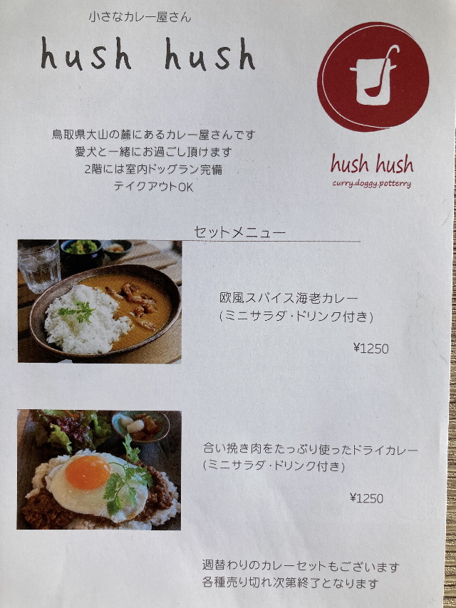 「小さなカレー屋さん hush hush」は、鳥取県西伯郡伯耆町にある手作りカレー屋さんです。2023年6月に空き地だった場所から新築オープンし、2階には室内ドッグランと食事用テーブルが併設されているため、1階でも2階でもペットと一緒に楽しむことができます。