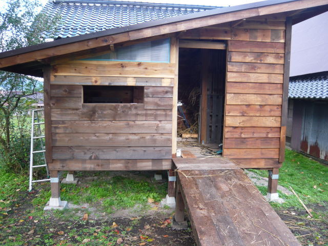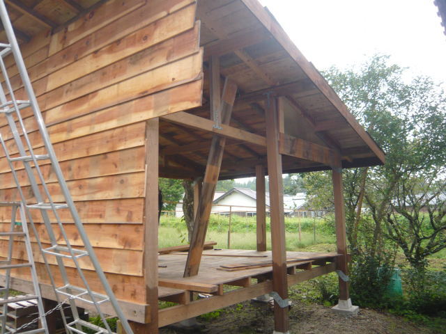 ヤギ小屋づくりですが、母屋の仕様は地上3メートルです。ほぼ完成間近でオーナーの伸一さんが一年分の藁を蓄えてる状態です。