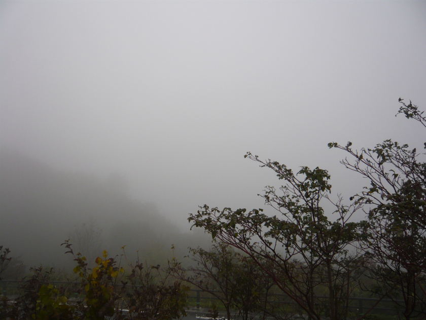 鬼女台から大山 10月25日午後13時撮影 天候 霧雨 気温8度 紅葉にはもう少し時間がかかりそうです。今日はお土産屋さんは定休日。濃霧で何も見えませんでした。